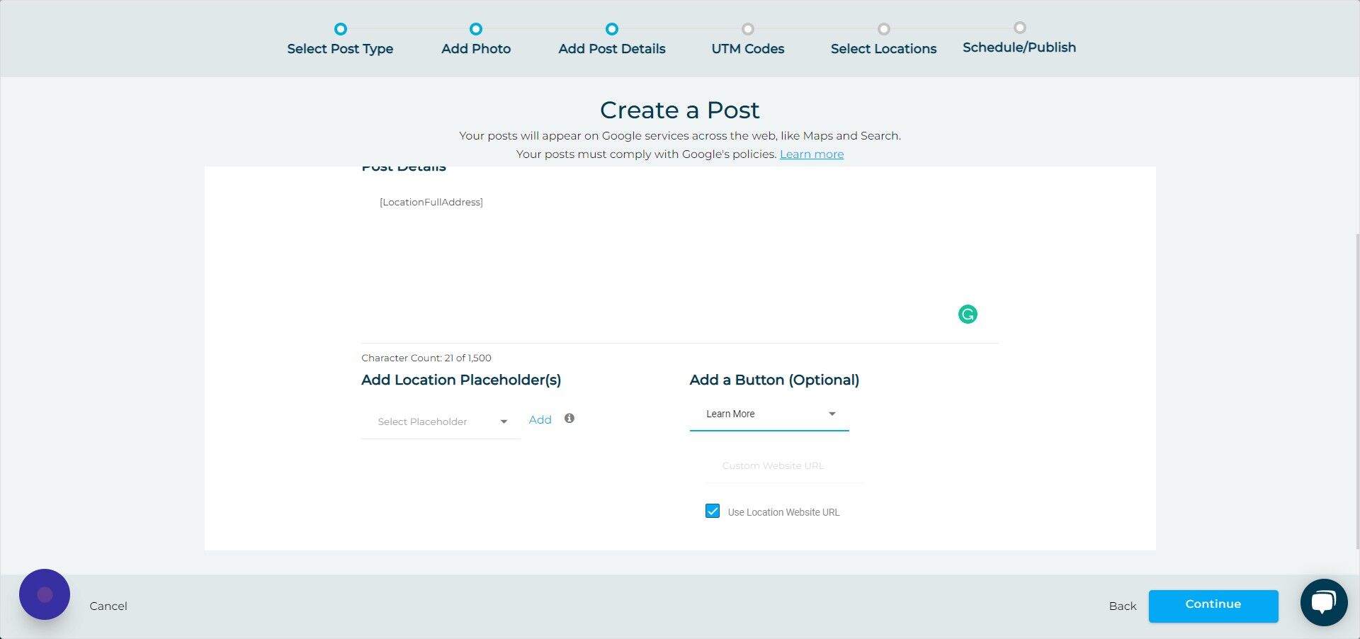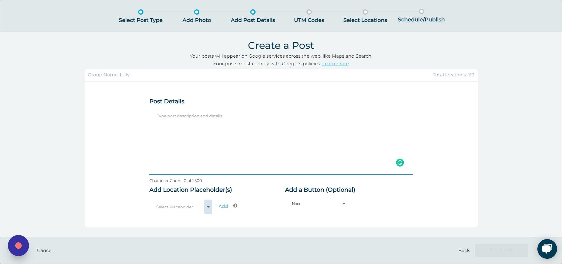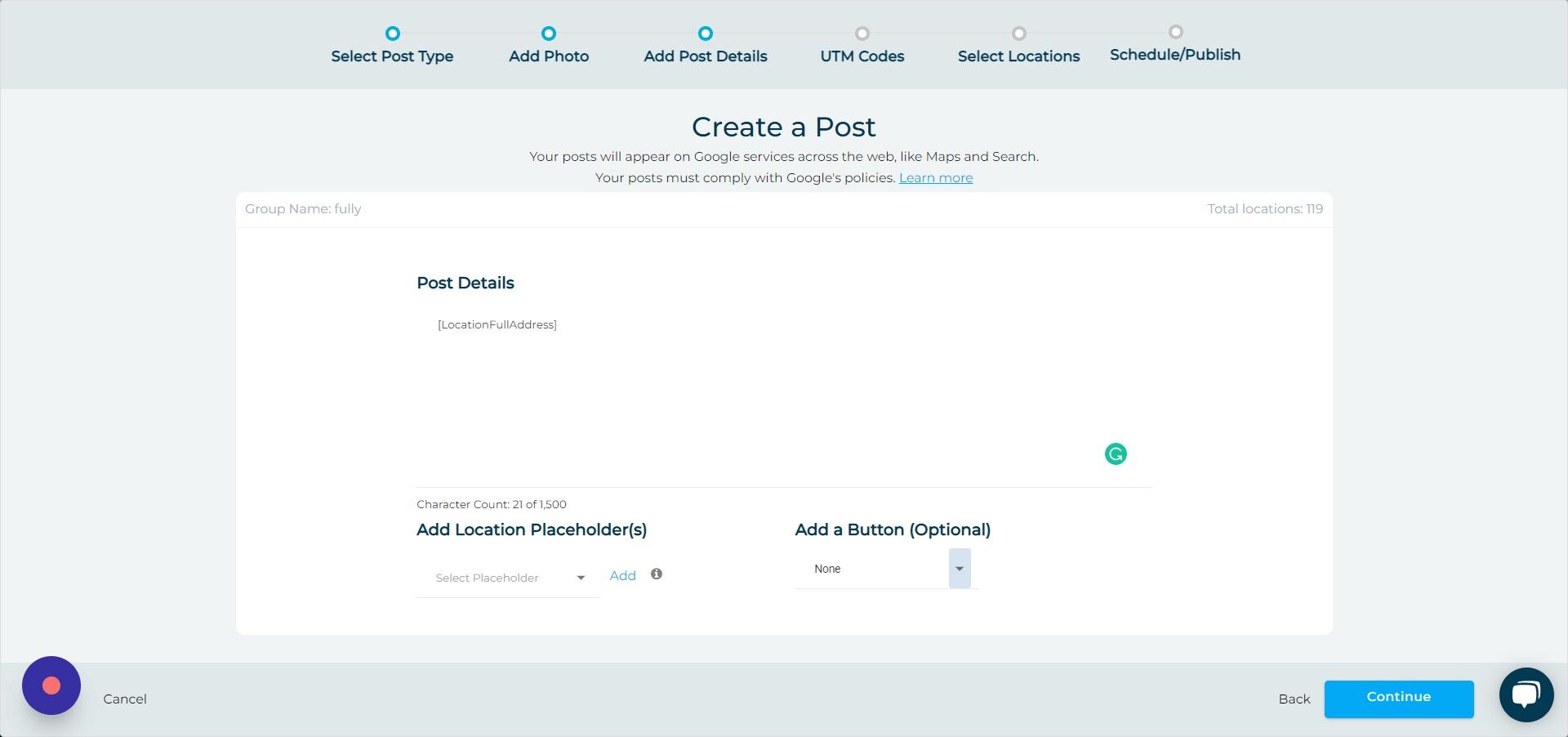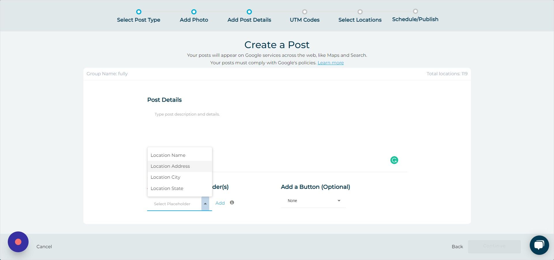 9. You may also add placeholders - this is useful if you are scheduling a post for multiple locations and want to make certain aspects of the post unique, such as location addresses.