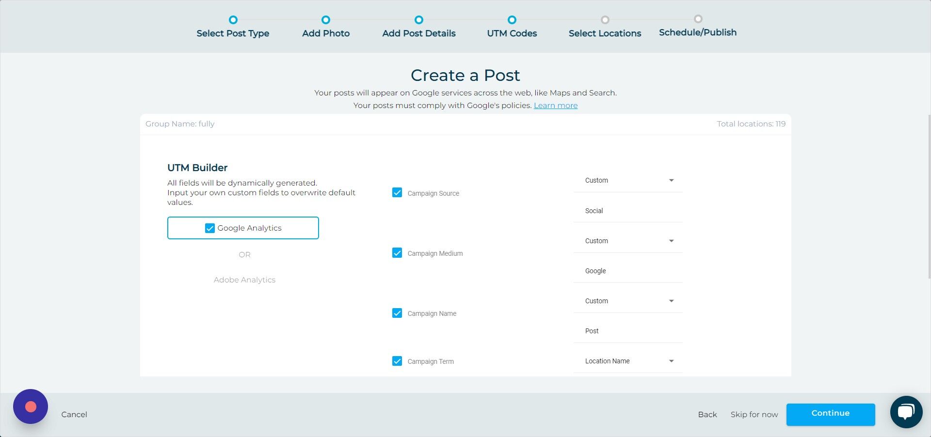 17. Our Post tool also provides a built-in UTM builder that you can customize. Provide the desired metrics, and the UTM will automatically be applied to the post and link to your Google Analytics account
