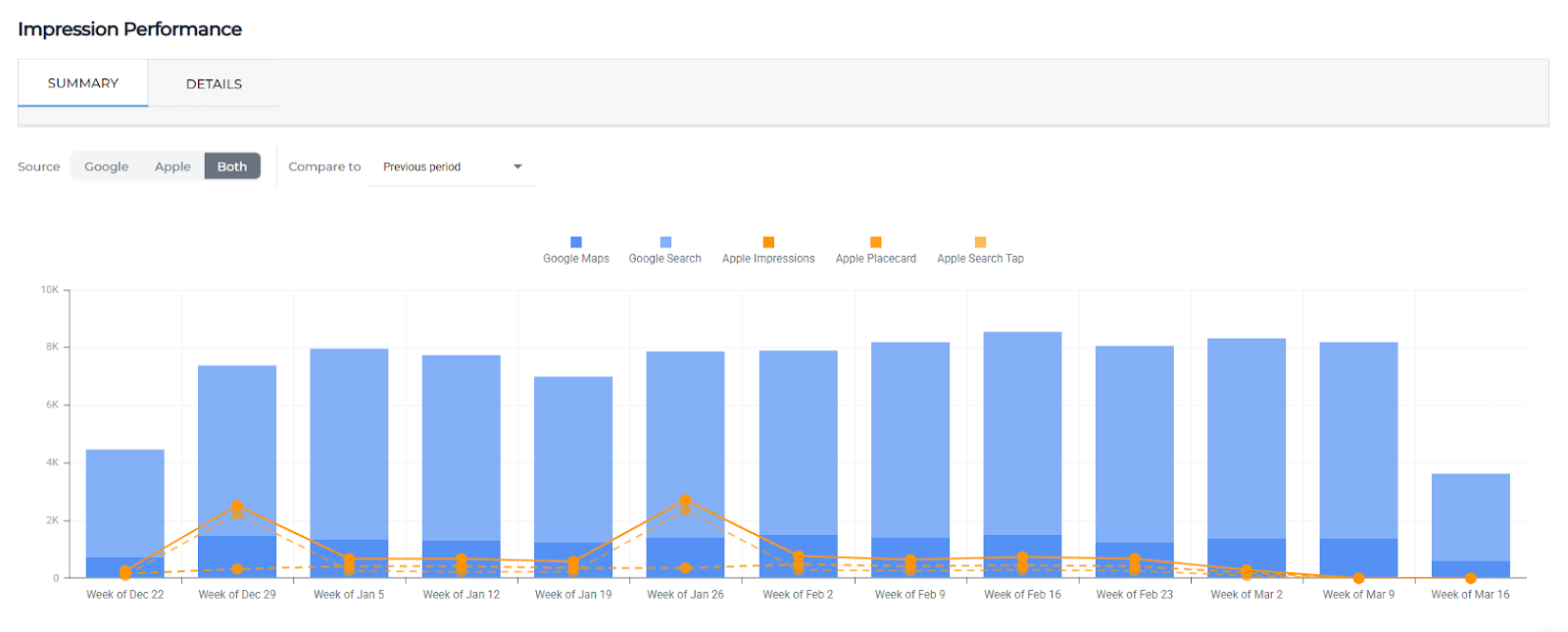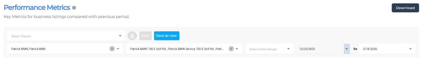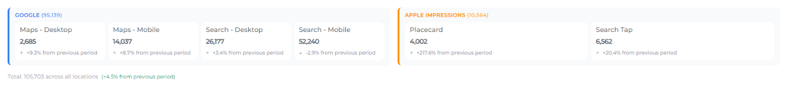 This enhanced performance report consolidates your Google Business Profile and Apple Business Connect data into a single, unified view—giving you a clearer picture of how customers discover and engage with your locations. With flexible filtering by account, group, location, and date range, this report enables precise performance analysis, trend identification, and more informed optimization decisions.