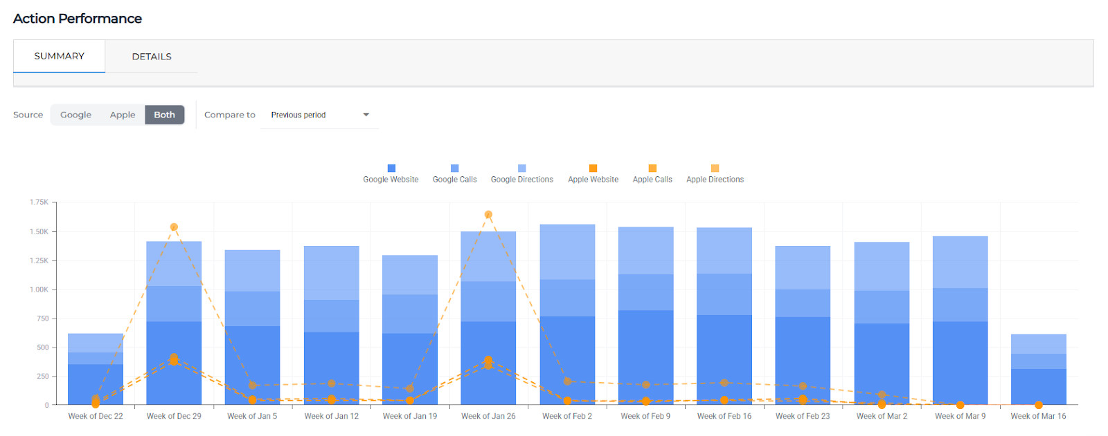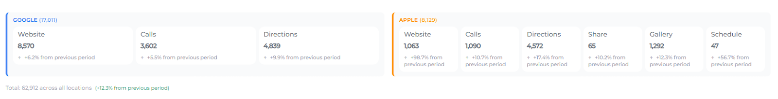 This section highlights customer actions taken on your listings across both Google and Apple platforms. It includes a visual trend graph and a cumulative summary table with period-over-period comparisons.