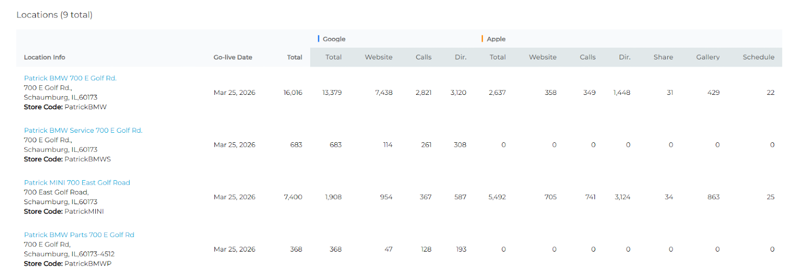 All metrics listed above (Google Website, Google Calls, Google Directions, Apple Website, Apple Calls, Apple Directions, Apple Share, Apple Gallery, Apple Schedule) follow the same definitions as in Section 1, but are segmented per location.