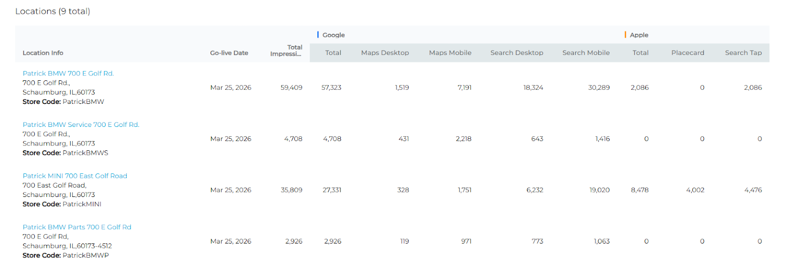 All metrics listed in Section 3 (Google Maps – Desktop, Google Maps – Mobile, Google Search – Desktop, Google Search – Mobile, Apple Placecard, Apple Search Tap) follow the same definitions, but are segmented per location.